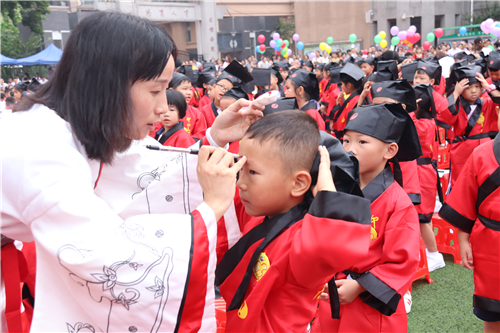許多家長(zhǎng)一起陪同孩子參加這場(chǎng)別開(kāi)生面的“開(kāi)筆禮”。隨著活動(dòng)的進(jìn)行,孩子們換上了中國(guó)傳統(tǒng)民族服裝-----漢服。在老師的帶領(lǐng)下通過(guò)正衣冠、敬拜孔子、誦讀《弟子規(guī)》、朱砂開(kāi)智、啟蒙描紅、擊鼓鳴志等一系列的儀式,感受傳統(tǒng)文化的博大精深。同時(shí)學(xué)校也希望通過(guò)舉行這種古典莊重的儀式,讓孩子在跨入小學(xué)大門之際,體會(huì)到身為學(xué)子的蛻變;讓孩子們從中學(xué)會(huì)做人、學(xué)會(huì)感恩。