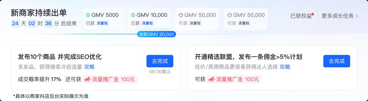 新商家跟著指引走,每個階段完成相關任務或達到一定目標,領取相應激勵,就能實現快速躍遷。具體來說:入駐后,發(fā)布一個商品,新商就能獲得千川新客100元隨心推券等,贏得免費增加曝光量的機會;賣出第一單后,獎勵運費險30天100單免單等,可以提升商品的價格優(yōu)勢;30單出體驗分后,根據GMV可獲得相應的流量扶持,最高可達30%。成長陣地的指引,會使新手經營初期更有規(guī)劃、效率更高。