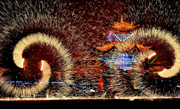 1月13日晚,在山東省棗莊市臺兒莊古城,民間表演隊為游客表演“火龍鋼花”。春節(jié)臨近,山東省棗莊市臺兒莊古城“年味”大戲持續(xù)上演,“火龍鋼花”、百獅賀歲、社火巡游等非物質文化遺產表演輪番上演,精彩紛呈,為市民和游客獻上精彩的“文化大餐”。 cnsphoto 供圖