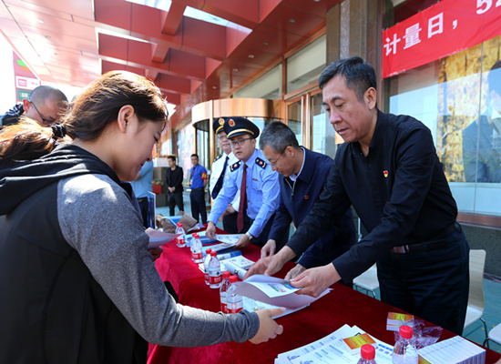 向市民發(fā)放宣傳材料。董芳忠攝 據(jù)了解,5月20日上午,在石景山區(qū)喜隆多新國際購物中心廣場,由石景山區(qū)創(chuàng)建全國文明城區(qū)辦公室指導(dǎo),區(qū)市場監(jiān)督管理局開展“誠信計(jì)量、文明經(jīng)商、迎接奧運(yùn)、創(chuàng)建文明城區(qū)暨‘5·20’世界計(jì)量日”大型主題宣傳活動(dòng)?;顒?dòng)期間,市場監(jiān)管工作人員深入街道社區(qū)、企業(yè)、商場超市等場所宣傳計(jì)量相關(guān)知識(shí),通過知識(shí)講座、發(fā)放宣傳資料、播放公益宣傳片、布置宣傳展板、設(shè)立維修檢測服務(wù)臺(tái)、開放實(shí)驗(yàn)室、受理計(jì)量投訴等形式,大力宣傳普及與廣大市民日常生活密切相關(guān)的計(jì)量常識(shí),讓社會(huì)大眾加深了解計(jì)量的相關(guān)知識(shí)。
