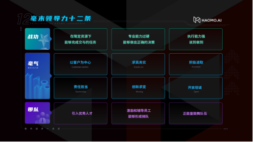 針對(duì)此,顧維灝認(rèn)為,算力、算法與感知硬件的進(jìn)步作為輔助,能夠?yàn)樽詣?dòng)駕駛的到來提供加速,但其核心仍然是數(shù)據(jù),數(shù)據(jù)是人工智能最大的驅(qū)動(dòng)力。在運(yùn)用數(shù)據(jù)智能推動(dòng)AI自動(dòng)駕駛進(jìn)化的過程中,毫末總結(jié)了自動(dòng)駕駛能力發(fā)展曲線: F=Z0+M(X),其中F代表產(chǎn)品力,Z0代表毫末第一代產(chǎn)品,M是一個(gè)把數(shù)據(jù)轉(zhuǎn)化為知識(shí)的函數(shù),包括數(shù)據(jù)獲取、表達(dá)、存儲(chǔ)、傳輸、計(jì)算、驗(yàn)證,以及對(duì)成本和速度的影響。而毫末打造的中國首個(gè)數(shù)據(jù)智能體系MANA便是這最核心的M。目前,MANA的學(xué)習(xí)時(shí)長超過了27萬小時(shí),虛擬駕齡相當(dāng)于人類司機(jī)駕駛2萬年,同時(shí)依托于加速增長的大規(guī)模真實(shí)道路行駛數(shù)據(jù)的不斷“哺育”,毫末的數(shù)據(jù)閉環(huán)能力也已成功構(gòu)建?!皵?shù)據(jù)智能是 AI 自動(dòng)駕駛技術(shù)進(jìn)化的核心,也是毫末的‘思想鋼印’?!鳖櫨S灝總結(jié)稱。 同時(shí),基礎(chǔ)技術(shù)的變化也在驅(qū)動(dòng)著解決方案的改變,毫末正從第一性原理出發(fā),思考新的解決方案。這一思考的第一個(gè)結(jié)果,即是毫末自動(dòng)駕駛的進(jìn)化更多依賴數(shù)據(jù)智能體系MANA的進(jìn)步。對(duì)第一性原理的思考與應(yīng)用,推動(dòng)毫末快速成為乘用車輔助駕駛和末端物流自動(dòng)配送車領(lǐng)域的領(lǐng)先者。 在乘用車領(lǐng)域,毫末HPilot輔助駕駛系統(tǒng)在一年內(nèi)即完成了3次版本迭代,目前已搭載于長城近十款量產(chǎn)車型,輔助駕駛用戶行駛里程已突破1300萬公里,持續(xù)領(lǐng)跑中國量產(chǎn)自動(dòng)駕駛市場。此外,毫末HPilot 3.0即將量產(chǎn)交付,帶來以“重感知“為特色的城市NOH功能。末端物流自動(dòng)配送車領(lǐng)域,毫末與美團(tuán)、物美、阿里達(dá)摩院等頭部合作伙伴達(dá)成深度戰(zhàn)略合作,即將量產(chǎn)下線的小魔駝2.0,是全球首款10萬元級(jí)末端物流自動(dòng)配送車,有望推動(dòng)末端物流領(lǐng)域的自動(dòng)駕駛進(jìn)一步落地。 毫末智行成立僅兩年多即躋身自動(dòng)駕駛第一陣營,不僅源于對(duì)技術(shù)創(chuàng)新的信仰與熱愛,毫末的企業(yè)文化也在其中起著潛移默化的影響。顧維灝也詳細(xì)介紹了 “毫末智行領(lǐng)導(dǎo)力十二條”, 從戰(zhàn)功、“毫”氣、帶隊(duì)三個(gè)方面拆解了毫末團(tuán)隊(duì)的領(lǐng)導(dǎo)力要求?!皹溆懈Ψ比~茂,水有源而長流不息,企有魂而基業(yè)長青。”他表示,隨著公司的快速發(fā)展,每個(gè)人都可以在毫末的平臺(tái)上擁有更大的發(fā)展空間,都可以通過毫末智行領(lǐng)導(dǎo)力來發(fā)揮更大的價(jià)值。希望通過團(tuán)隊(duì)上下的共同努力,將毫末建設(shè)成頂級(jí)的自動(dòng)駕駛公司。
