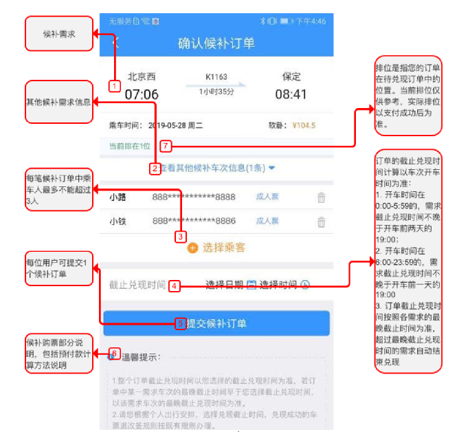 12306客戶端內(nèi)的候補(bǔ)購票示意圖 釋疑2 “候補(bǔ)購票”如何收費(fèi)? 候補(bǔ)購票預(yù)付款按訂單計(jì)算,每單預(yù)付款按該單的不同組合需求中票款最高的額度計(jì)算(臥鋪按下鋪票價(jià)計(jì)算)。用戶購票成功結(jié)算票款時(shí),預(yù)付款若超出實(shí)際票款的,系統(tǒng)將自動(dòng)退回余額。候補(bǔ)購票服務(wù)不額外加收任何費(fèi)用。 候補(bǔ)購票訂單的提交、兌現(xiàn)時(shí)間與網(wǎng)站運(yùn)營時(shí)間一致,為每日的6:00至23:00。開車時(shí)間在0:00-5:59的,候補(bǔ)終止時(shí)間不晚于開車前兩天的19:00;開車時(shí)間在6:00-23:59的,候補(bǔ)終止時(shí)間不晚于開車前一天的19:00。 鐵路部門表示,在上述時(shí)間范圍內(nèi),旅客可在提交候補(bǔ)訂單時(shí)自主設(shè)定終止兌現(xiàn)時(shí)間,也可在提交候補(bǔ)訂單后隨時(shí)主動(dòng)終止兌現(xiàn)。旅客主動(dòng)終止或系統(tǒng)自動(dòng)終止候補(bǔ)的,系統(tǒng)自動(dòng)全額退還預(yù)付款。候補(bǔ)購票訂單的提交、成功或終止,鐵路部門均將通過短信、微信、手機(jī)客戶端等方式向用戶推送,存在行程沖突的,一并在消息中提醒旅客。 提示信息: 1、兌現(xiàn)時(shí),將根據(jù)乘客所候補(bǔ)列車的席位實(shí)際情況予以分配,多人出行時(shí),可能分配到不同車廂,遇有臥代座時(shí),將按座席予以分配。 2、兌現(xiàn)成功車票的退改簽規(guī)則按既有規(guī)則辦理,退票費(fèi)按如下規(guī)則核收:票面乘車站開車時(shí)間前15天(不含)以上不收取退票費(fèi),48小時(shí)以上的按票價(jià)5%計(jì),24小時(shí)以上、不足48小時(shí)的按票價(jià)10%計(jì),不足24小時(shí)的按票價(jià)20%計(jì)。改簽或變更到站后的車票乘車日期在春運(yùn)期間的,退票時(shí)一律按開車時(shí)間前不足24小時(shí)標(biāo)準(zhǔn)核收退票費(fèi)。上述計(jì)算的尾數(shù)以5角為單位,尾數(shù)小于2.5角的舍去、2.5角及以上且小于7.5角的計(jì)為5角、7.5角及以上的進(jìn)為1元。退票費(fèi)最低按2元計(jì)收。 3、應(yīng)退款項(xiàng)按支付時(shí)使用的在線支付工具相關(guān)規(guī)定,將在規(guī)定時(shí)間內(nèi)按支付渠道原路返回。 4、兌現(xiàn)時(shí)實(shí)名制和行程沖突規(guī)則按既有規(guī)則辦理。