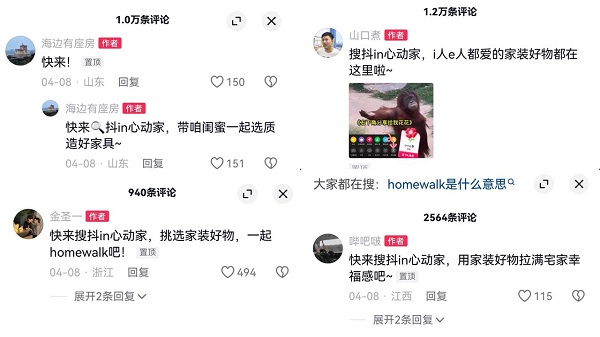 創(chuàng)意視頻、探家系列視頻、達(dá)人視頻、熱詞打造、商家激勵(lì)……一系列舉措環(huán)環(huán)相扣,「抖in心動(dòng)家」成功聯(lián)動(dòng)明星、達(dá)人、商家等共同創(chuàng)作的內(nèi)容場(chǎng),和家具家裝行業(yè)商家組成的貨架場(chǎng)。優(yōu)價(jià)商家「排排坐,分果果」,獲得海量的垂類(lèi)內(nèi)容篩選流量,低成本實(shí)現(xiàn)爆品打造,激發(fā)品牌增長(zhǎng)新動(dòng)能。此外,「抖in心動(dòng)家」還打通抖音和住小幫,在更加精準(zhǔn)的人群中進(jìn)行品牌深度種草。