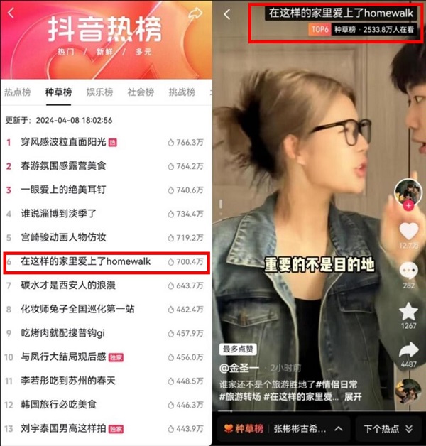 同時(shí),「抖in心動(dòng)家」結(jié)合春季家裝節(jié)點(diǎn)和站內(nèi)高熱話(huà)題citywalk,以家為核心打造新詞「homewalk」,聯(lián)動(dòng)與家場(chǎng)景強(qiáng)相關(guān)的熱度達(dá)人輸出趣味內(nèi)容,放大活動(dòng)影響力,商家也可借勢(shì)熱點(diǎn)話(huà)題,獲得曝光提升。4月8日,熱點(diǎn)話(huà)題詞#在這樣的家里愛(ài)上了homewalk 攀升至抖音種草榜TOP6,播放量高達(dá)3100w+。商家也能夠通過(guò)將這些熱點(diǎn)與自身的商品和短視頻內(nèi)容相結(jié)合,獲取平臺(tái)推薦流量,提升內(nèi)容場(chǎng)和貨架場(chǎng)的生意增量。