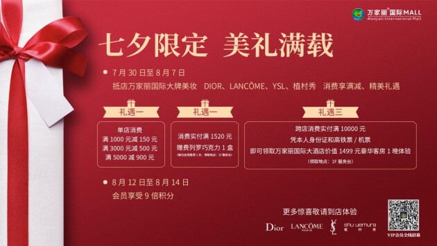 一年一次的浪漫七夕,想和TA在一望無(wú)垠的橘子海里看浪漫、俯瞰星城夜幕下的璀璨燈火、享格調(diào)品味的下榻體驗(yàn)、再共進(jìn)一場(chǎng)燭光晚餐?這次不如嘗試文化特色酒店——萬(wàn)家麗國(guó)際國(guó)際大酒店,畢竟,愛也需要新鮮感和新體驗(yàn)。  萬(wàn)家麗國(guó)際大酒店七夕至臻禮遇。8月1日-4日,萬(wàn)福中餐廳充值777元送223元,儲(chǔ)值卡總計(jì)1000元;再贈(zèng)70元國(guó)際大牌美妝券。(使用規(guī)則:分2次使用,一次僅可使用500元,可與其他優(yōu)惠同享,大廳、包廂皆可使用,儲(chǔ)值卡截止使用期限為2022年12月31日)更多活動(dòng)詳情請(qǐng)關(guān)注湖南萬(wàn)家麗實(shí)業(yè)集團(tuán)官方微信公眾號(hào)。  位于七星設(shè)計(jì)標(biāo)準(zhǔn)五星收費(fèi)萬(wàn)家麗國(guó)際大酒店26樓的萬(wàn)福中餐廳設(shè)有私人包間28間以及景觀長(zhǎng)廊,餐廳聘請(qǐng)全國(guó)各地頂級(jí)的名廚大師,大董意境菜、果木烤鴨及京式糕點(diǎn)等多款夏日精選美食助力浪漫“七夕之夜”!  萬(wàn)家麗國(guó)際大酒店,擁有萬(wàn)家麗文化酒店和萬(wàn)家麗世貿(mào)酒店兩個(gè)七星設(shè)計(jì)標(biāo)準(zhǔn)五星收費(fèi)酒店,商務(wù)客房與各類特色客房有近千套,提供休閑享受的一站式服務(wù)。以愛之名,為愛奉送,為游客朋友帶來(lái)超豪華寬敞的浪漫空間,加磅助攻甜蜜之夜。  △酒店十四大優(yōu)勢(shì) 酒店文化底蘊(yùn)深厚,3萬(wàn)平方米的世界文化大觀園,容納亭臺(tái)樓閣、福地銅雕、文化館等。各大場(chǎng)館的豐富文化內(nèi)涵,不禁讓游人感嘆:“足不出戶,就能在“博物館”里看世界?!?/p> 尤其是今年夏天,繼凌晨爬岳麓山看日出之后,萬(wàn)家麗廣場(chǎng)28F頂樓的停機(jī)坪,也成為游客新的日落觀賞打卡點(diǎn)。在這片“人間天堂”,萬(wàn)家麗每時(shí)每刻上演的晚霞都美得各不相同。這座停機(jī)坪可容納118架直升機(jī),免費(fèi)向公眾開放,哪怕人山人海也總會(huì)找到合適的空間拍照。  浪漫七夕粉絲節(jié),萬(wàn)家麗集團(tuán)系列限定企劃,給您專享禮遇,1F DIOR、LANC?ME、YSL、植村秀,以珍禮之藝傳遞甜蜜愛意,邀您探索心意之禮。積分全國(guó)通用、價(jià)格低于免稅店,更多驚喜敬請(qǐng)到店體驗(yàn)。  愛情斑馬線,今生和TA一起走 人生的每個(gè)路口,都要陪你一起走,從青絲到白發(fā),都要與愛的TA攜手走過(guò),愛的斑馬線空降宇宙中心萬(wàn)家麗,一起去打卡吧。 愛在緣宇宙 共賞橘子海 晚霞相伴,來(lái)一場(chǎng)空中浪漫告白,讓我們的緣分從宇宙中心開始吧!8月4日七夕當(dāng)天,18:00-21:00,出片神址28F萬(wàn)家麗停機(jī)坪強(qiáng)勢(shì)助攻,派發(fā)仙女棒、個(gè)性手舉牌,還有專屬攝影團(tuán)隊(duì),讓打卡照氛圍感滿滿 !分享發(fā)布社交平臺(tái)即有精美禮遇!關(guān)注“萬(wàn)家麗國(guó)際MALL”微信公眾號(hào)了解更多活動(dòng)詳情。  緣分交友墻 為你牽紅線 緣分交友墻,讓沉睡的多巴胺和荷爾蒙起床吧!在不確定的世界,如何找到確定的那個(gè)你,來(lái)萬(wàn)家麗尋找一場(chǎng)未知的邂逅吧。8 月 4 日 11:00-19:00 萬(wàn)家麗“緣分交友墻”甜蜜上線,助攻單身男女們。貼下期盼,揭走邂逅,以真心換取真心,只要你主動(dòng)一點(diǎn)點(diǎn),就會(huì)有故事。 霸屏告白 緣定宇宙中心 七夕的主色調(diào)——告白,這次玩點(diǎn)霸氣的!8 月 4 日宇宙中心萬(wàn)家麗巨幕上演,幫你轉(zhuǎn)達(dá)對(duì)TA的愛意,即刻縈繞在這座城市的上空。現(xiàn)場(chǎng)掃碼關(guān)注萬(wàn)家麗國(guó)際MALL微信公眾號(hào),回復(fù)“我要告白”,上傳您想說(shuō)的話,就能在大屏幕找到屬于自己的“告白”時(shí)刻。愛TA,就一起來(lái)萬(wàn)家麗大屏下,給 TA 一場(chǎng)浪漫告白吧。  告白花園 邂逅心動(dòng)男友 告白花園,以花悅?cè)?,宇宙中心全城派花? 月 4 日16:00—18:00-20:00, 1F告白花園,向你發(fā)出心動(dòng)信號(hào)。愿所有人在幸福的節(jié)日里,收獲甜蜜心情。 “好柿發(fā)生”潮運(yùn)大抽獎(jiǎng) 嗨翻仲夏夜 8月1日-9月30日,全場(chǎng)購(gòu)物單次消費(fèi)滿199元/美妝滿500元/美食滿99元/超市滿99元即可至2F總服務(wù)臺(tái)/B2F超市服務(wù)臺(tái)領(lǐng)取抽獎(jiǎng)券。9月30日19:00線上線下送黃金飾品、國(guó)際大牌美妝儲(chǔ)值卡、品牌手機(jī)、超市購(gòu)物卡、豪華客房券、中餐廳儲(chǔ)值卡?,F(xiàn)場(chǎng)還可刮出搖大牌口紅,瓜分千份紅包,心愿盲盒,統(tǒng)統(tǒng)實(shí)現(xiàn)! 持續(xù)高能 生活超市全場(chǎng)7.5折 嗨翻暑期,萬(wàn)家麗生活超市位于萬(wàn)家麗國(guó)際MALL地鐵層(B2層)、地鐵2、5號(hào)線直達(dá)賣場(chǎng);每周二周三會(huì)員日享受全場(chǎng)正價(jià)商品8.5折;會(huì)員免費(fèi)停車,不定期好禮相送;要購(gòu)物要囤貨就來(lái)萬(wàn)家麗生活超市! 家居建材全場(chǎng)放價(jià),贏30萬(wàn)免單 萬(wàn)家麗家居建材廣場(chǎng)&家居生活廣場(chǎng)聯(lián)手眾多知名品牌,嗨翻暑假!8月21日萬(wàn)家麗“您購(gòu)物·我買單”鉅惠讓利,火熱來(lái)襲。金幣金蛋,百萬(wàn)豪禮;全場(chǎng)放價(jià),千萬(wàn)返現(xiàn)!買建材家具,中三十萬(wàn)免單,盡在萬(wàn)家麗。 七夕,與心愛的TA一路相伴,穿越人海,擇萬(wàn)